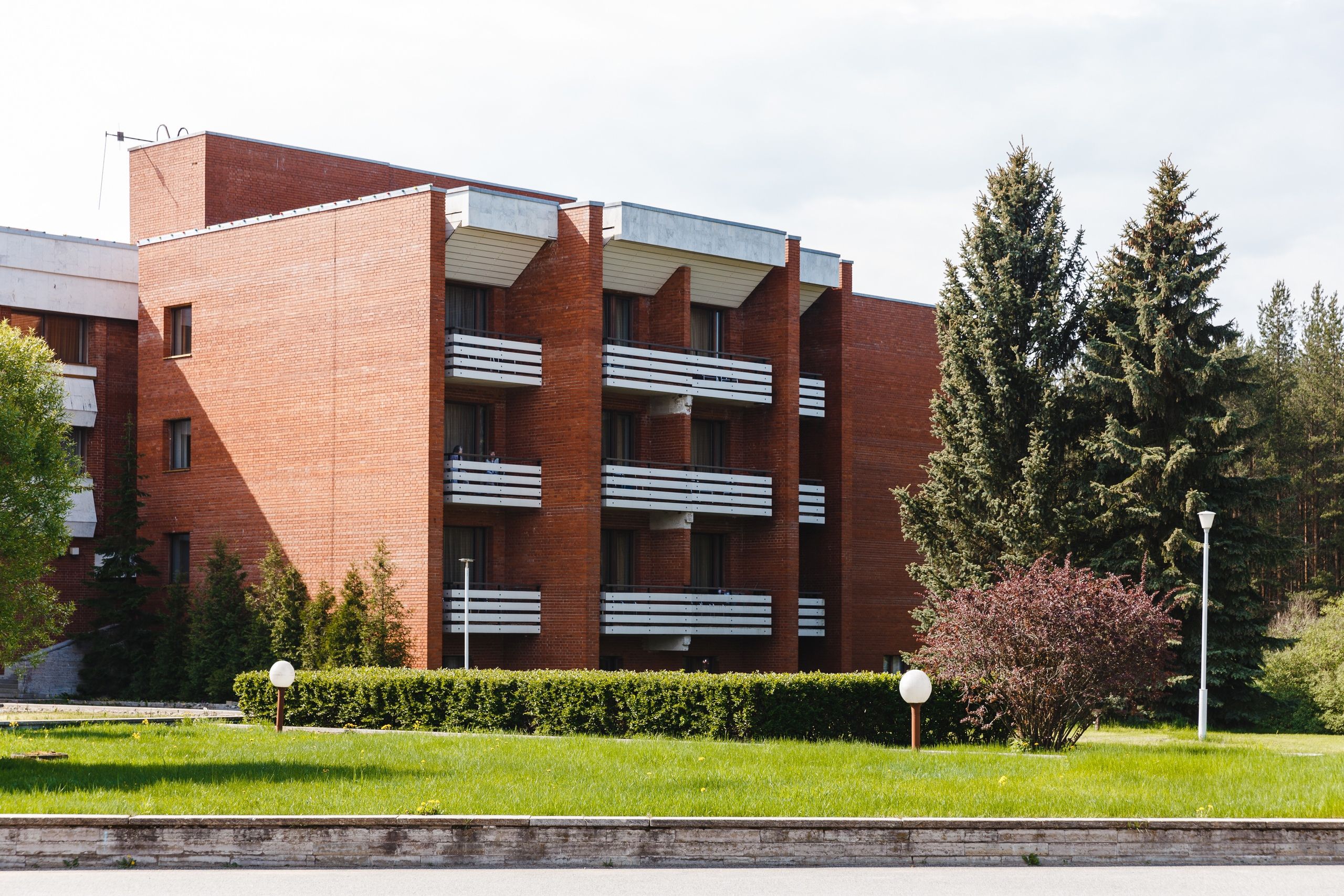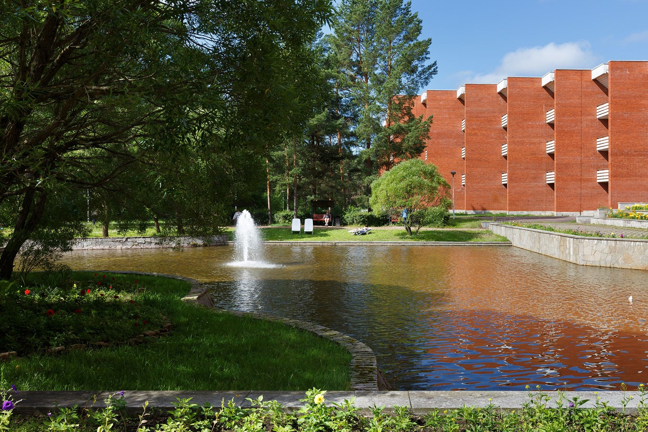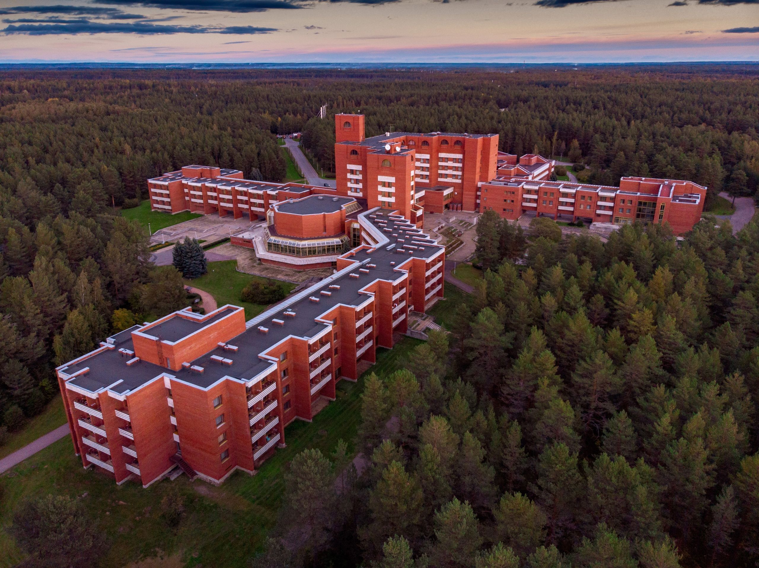В главном корпусе под одной крышей объединены все отделения санатория: медицинская часть, комфортабельные жилые номера, лечебно-физкультурный комплекс со спортзалом и бассейном, киноконцертный комплекс и другие службы.