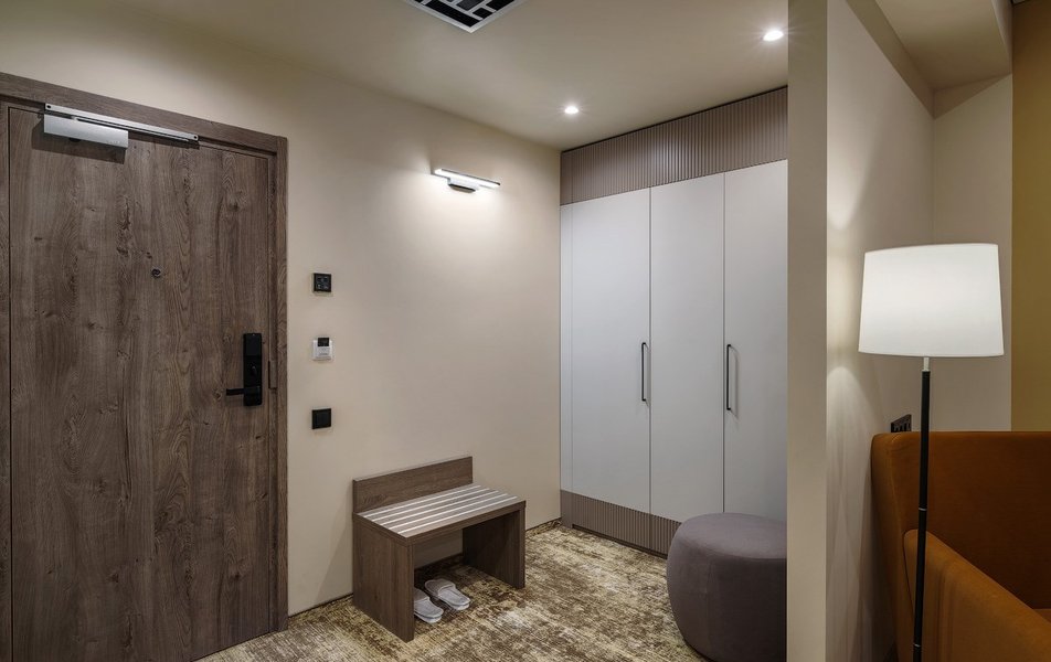 В номере: вешалка, диван, зеркало, кресло, кровать двуспальная, прикроватные тумбочки, стол, шкаф, мини-холодильник, сейф, телевизор ЖК, телефон, чайный набор посуды, электрочайник