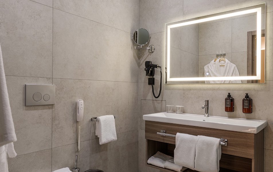 В номере: вешалка, зеркало, кресло, кровать двуспальная, прикроватные тумбочки, стол, тумба багажная, шкаф, мини-холодильник, сейф, телевизор ЖК, телефон, чайный набор посуды, электрочайник