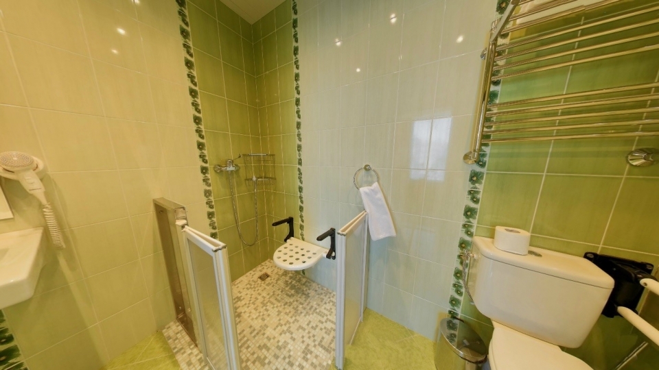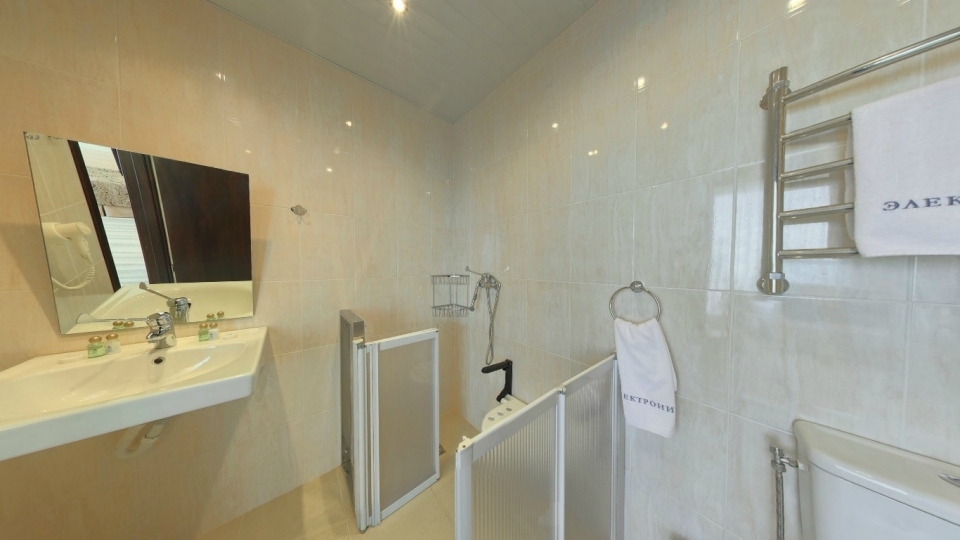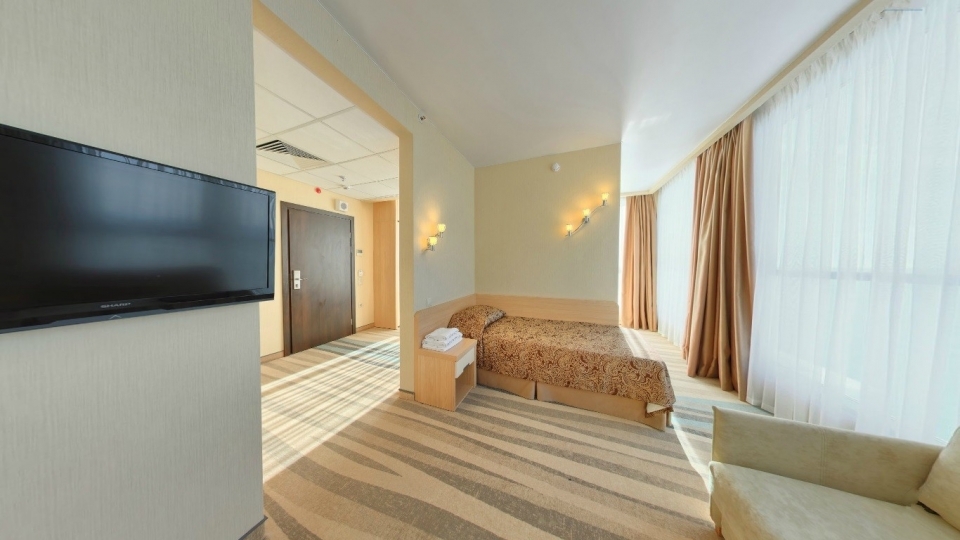 Оснащение номера: Двуспальная кровать, диван, обеденная группа, фен, тапочки, гладильный центр, телевизор, фригобар, шкаф для посуды, сервиз (6 персон), комплект столовых приборов (6 персон), сейф, wi-fi