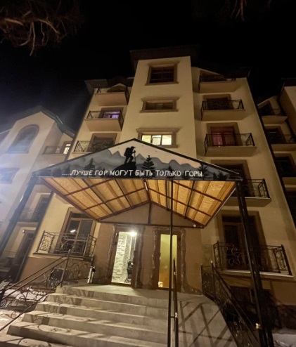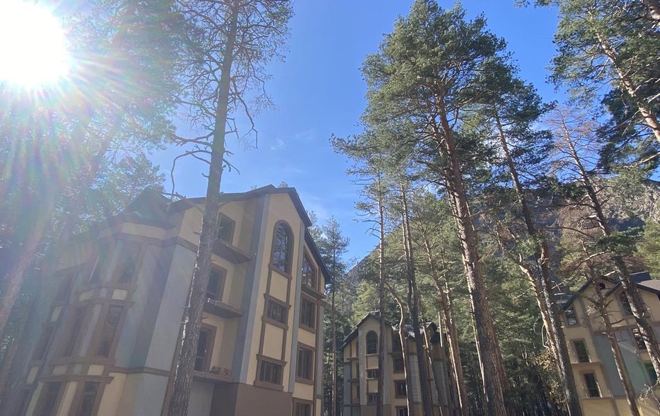 Четырехэтажный корпус отеля утопает в зелени хвойного леса и окружен величественными горными вершинами. В отеле представлено 35 комфортабельных номеров различных категорий, включая как уютные комнаты на цокольном этаже, так и роскошные двухуровневые апартаменты. Каждый номер оборудован отдельным санузлом и мини-кухней, оснащенной всей необходимой техникой, включая электрическую плиту. Для комфортного пребывания гостей в каждом номере установлены сплит-системы или кондиционеры.