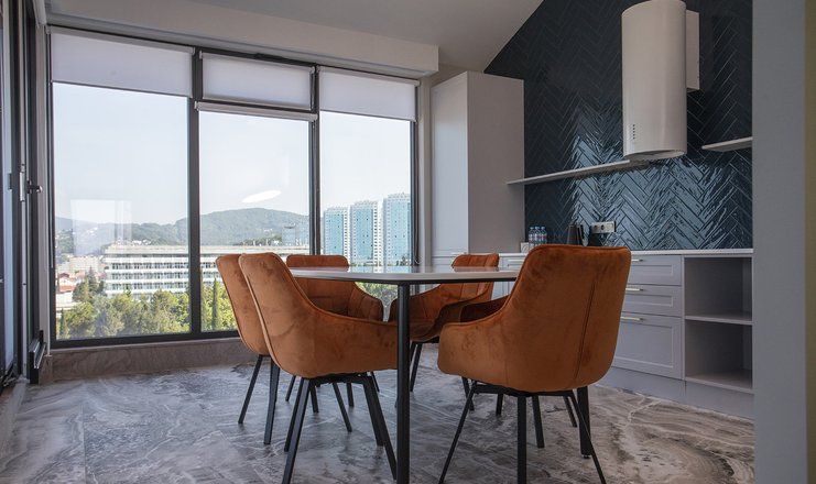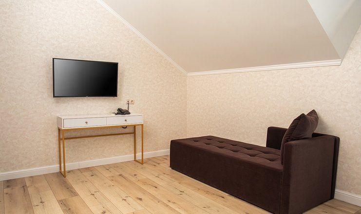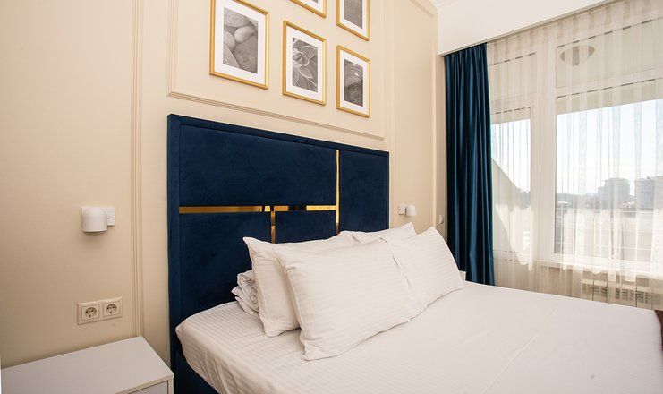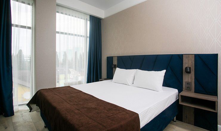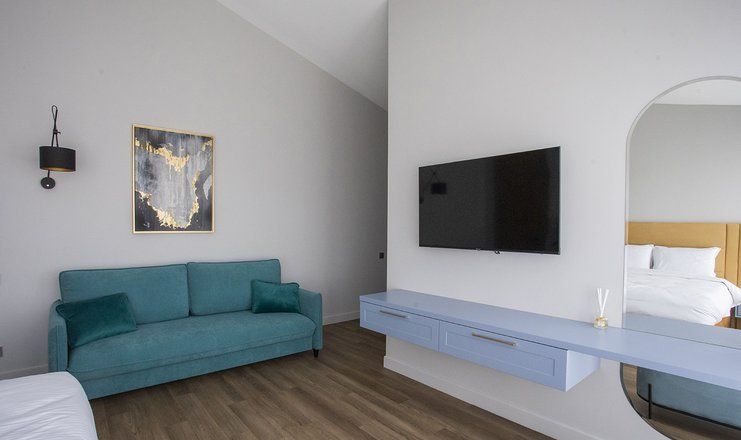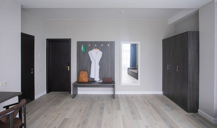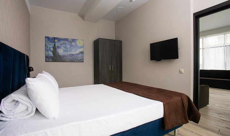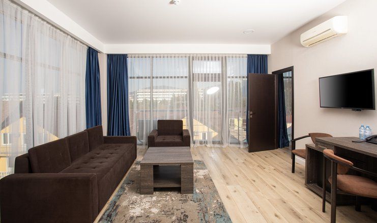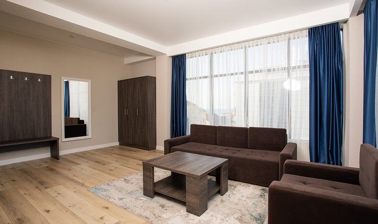 В номере: кровати двуспальные, кухонная мебель, набор мягкой мебели, прикроватные тумбочки, стол, столик журнальный, стулья, шкаф, гладильная доска, кондиционер, микроволновая печь, набор посуды, сейф, сплит-система, телевизор ЖК: 3, телефон, утюг, холодильник чайная станция и бутилированная вода