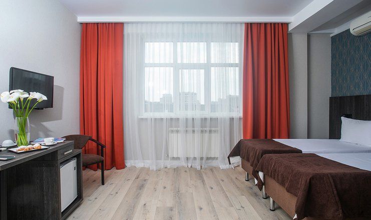 В номере: кровати односпальные /одна двуспальная кровать, прикроватные тумбочки, стол, столик журнальный, стулья, тумба багажная, шкаф, кондиционер, сейф, телевизор ЖК, телефон, холодильник, чайная станция и бутилированная вода, чайный набор посуды, электрочайник
