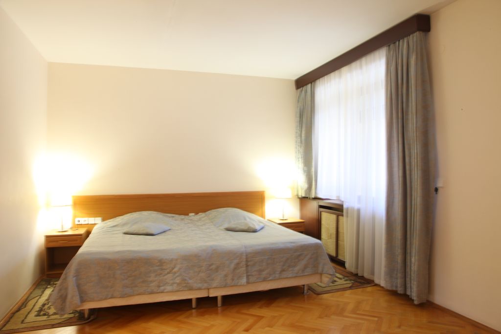 В номере: одна двуспальная либо две односпальные кровати, прикроватные тумбы, шкаф, стол, стулья, журнальный столик, мягкая мебель, кондиционер, спутниковое телевидение, холодильник, электрочайник