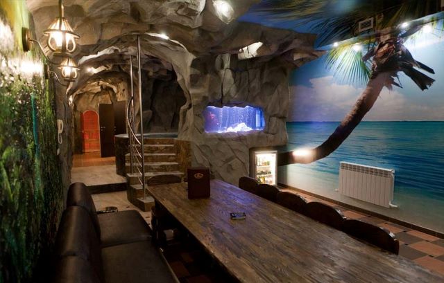 Просторный зал с бильярдом, финской сауной, комнатой отдыха и просторной обеденной зоной. Вас ждёт уникальная атмосфера с настоящими скалами, окружающими пещеру, где находится круглый бассейн с гидромассажной установкой и гейзером. Вода поддерживает температуру 30-32°C. Вдоль бассейна расположен аквариум с экзотическими рыбками, создавая фантастический мир дикой природы прямо внутри пещеры: побережье, лазурное море, скалы и удивительные рыбки. Зал "Пещера" обеспечит комфорт для 12 человек (за дополнительную плату возможно больше).