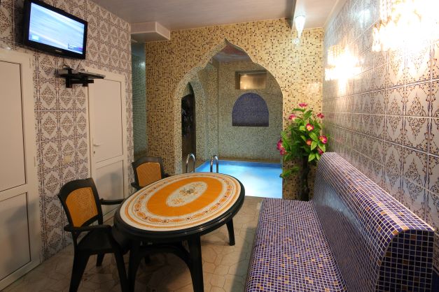 Это уютное пространство предназначено для отдыха души и тела. Зал идеально подходит для романтических свиданий, семейного отдыха, девичников и других мероприятий. Оформление в стиле "Восточной сказки" позволит вам расслабиться и почувствовать всю прелесть оздоровительного отдыха. Вас ждёт бассейн размером 3х3 метра с температурой 30-32°C, с чистейшей, гипоаллергенной водой, а также финская сауна и уютная обеденная зона. Зал "Восточный" рассчитан на 4 человека (за дополнительную плату возможно больше).