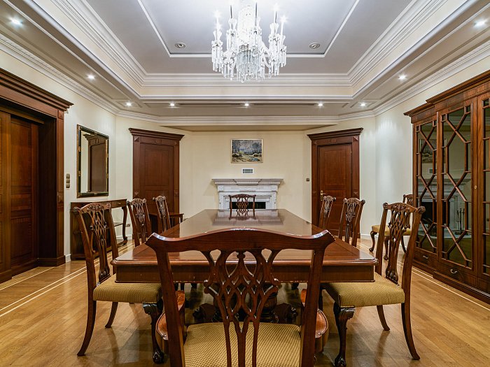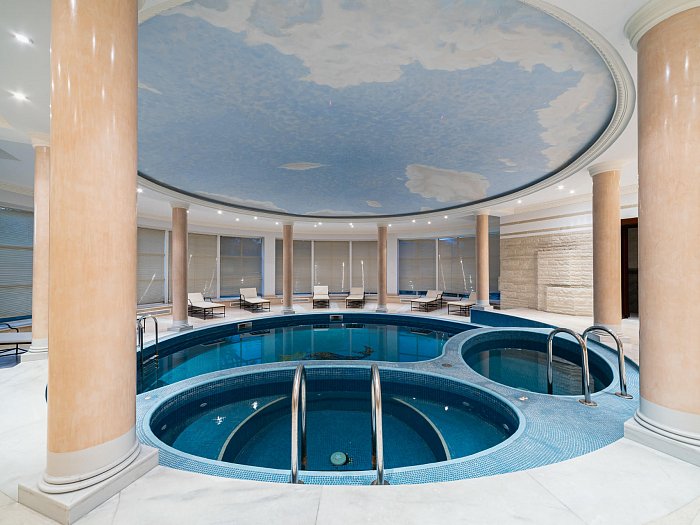 В номере: прихожая, гостиная, две спальни с гардеробом, две ванные комнаты, кухня, обеденный зал с камином, бильярдная, бассейн, сауна, кабинет для массажа, переговорной