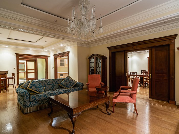 В номере: две комнаты: спальня и гостиная, односпальные кровати или одна двуспальная, прикроватные тумбы, зеркало, шкаф для одежды, пуфы, комод, мягкая мебель, журнальный стол, обеденный гарнитур, сейф, письменный стол, телевизор, кондиционер, фен, холодильник, чайник, Wi-Fi