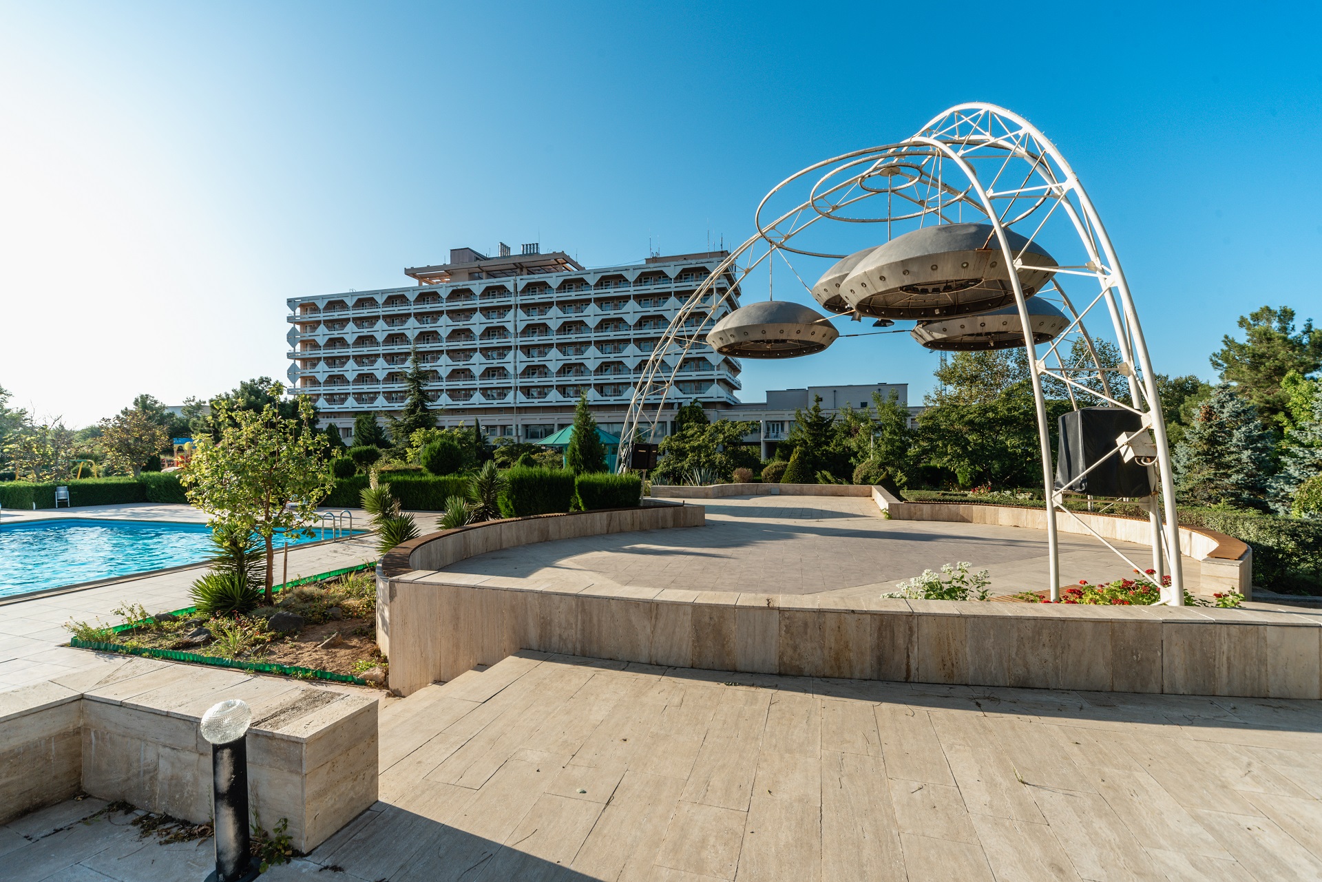 Санаторно-курортный комплекс "Планета" Евпатория - это девятиэтажный современный спальный корпус на 300 мест, оборудован лифтами. Все номера современные, с кондиционерами. Территория пансионата парковая, ухоженная, озеленённая, имеется искусственное озеро с лебедями, ручей.