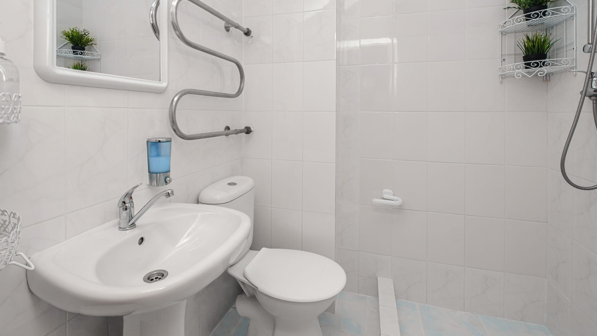 Санузел: душ, раковина, унитаз, фен, полотенца