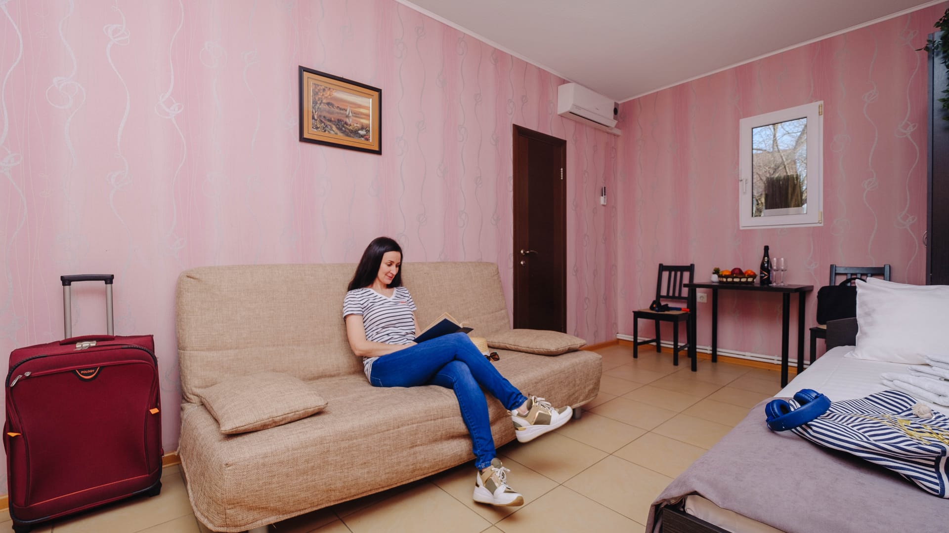 В номере: двуспальная кровать, односпальная кровать, прикроватные тумбы, стол, стулья, диван, журнальный стол, шкаф, холодильник, плоский телевизор, кондиционер, чайник, утюг (на этаже)