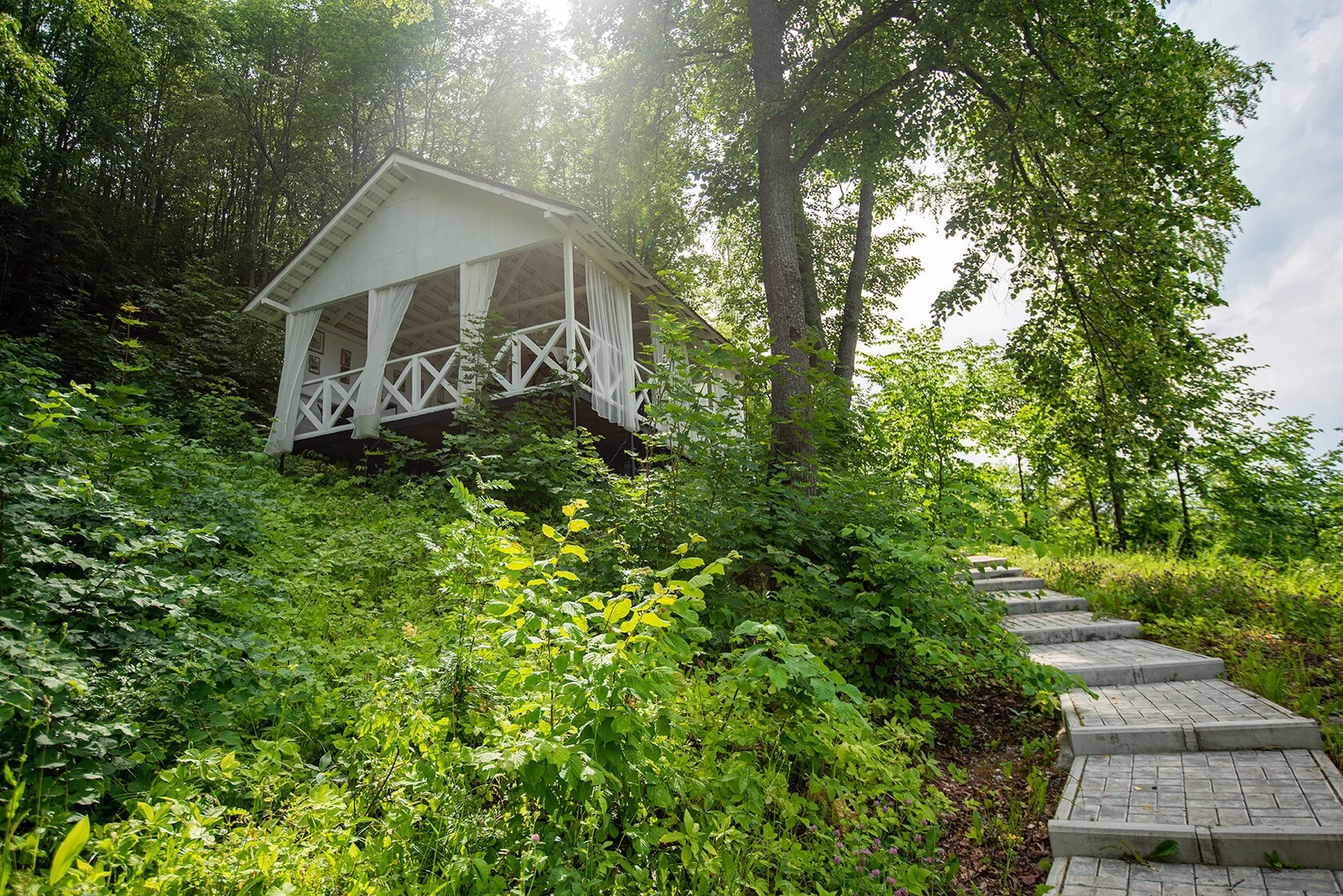 Обратите внимание! Беседка расположена на горе.