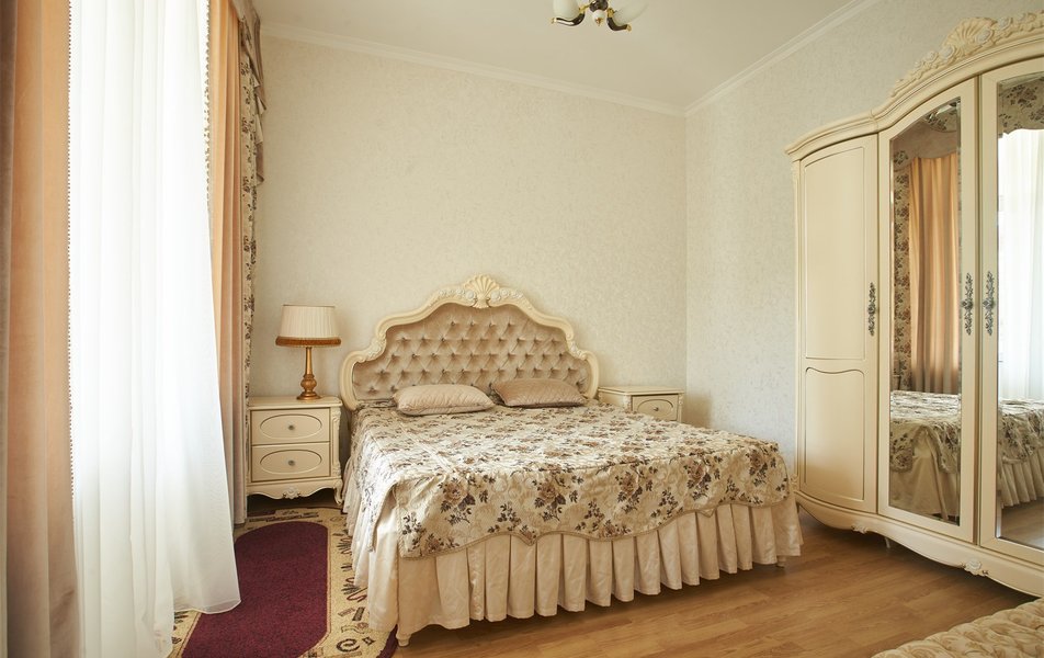 В номере: вешалка, зеркало, кресло, диван, кровати односпальные, двуспальная кровать, прикроватные тумбочки, стол, столик журнальный, шкаф, телевизор, телефон, холодильник, чайный набор посуды, электрочайник