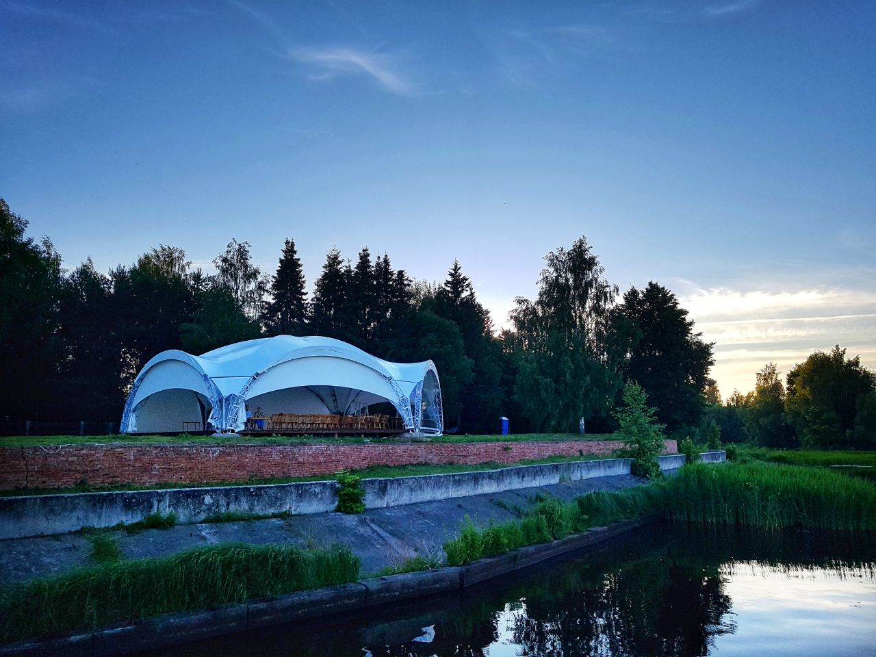 Белоснежный шатер стабилизировался в уединенной зеленой зоне с видом на Волгу.