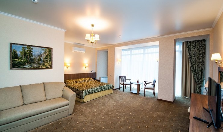 В номере: кровать двуспальная, стол, столик туалетный, стулья, тумба под телевизор, диван, гладильная доска, набор посуды, сейф, сплит-система, телевизор, утюг, холодильник, электрочайник