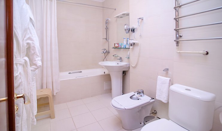 Санузел: ванна, раковина, унитаз, тапочки, туалетные принадлежности, фен, халат