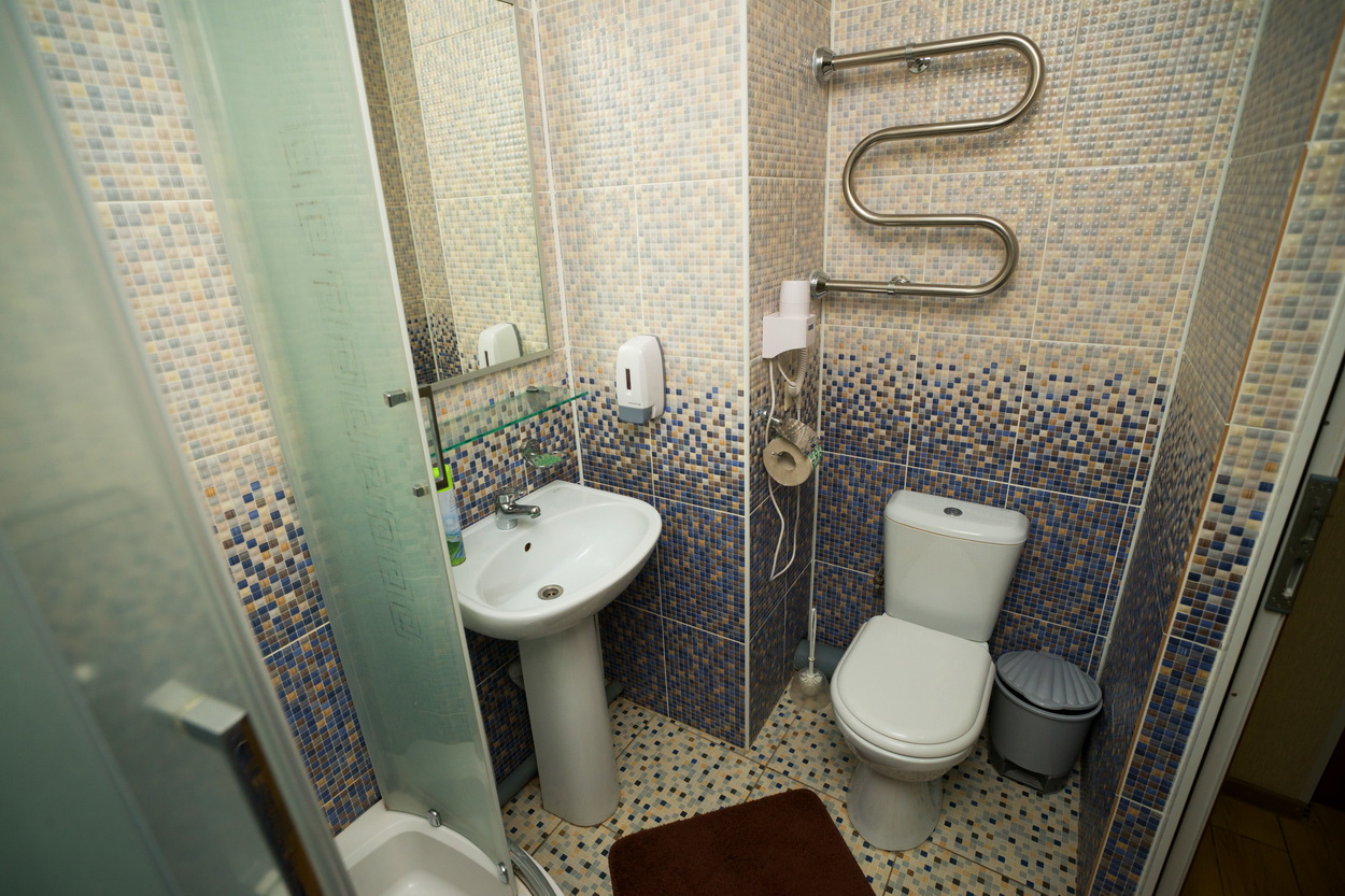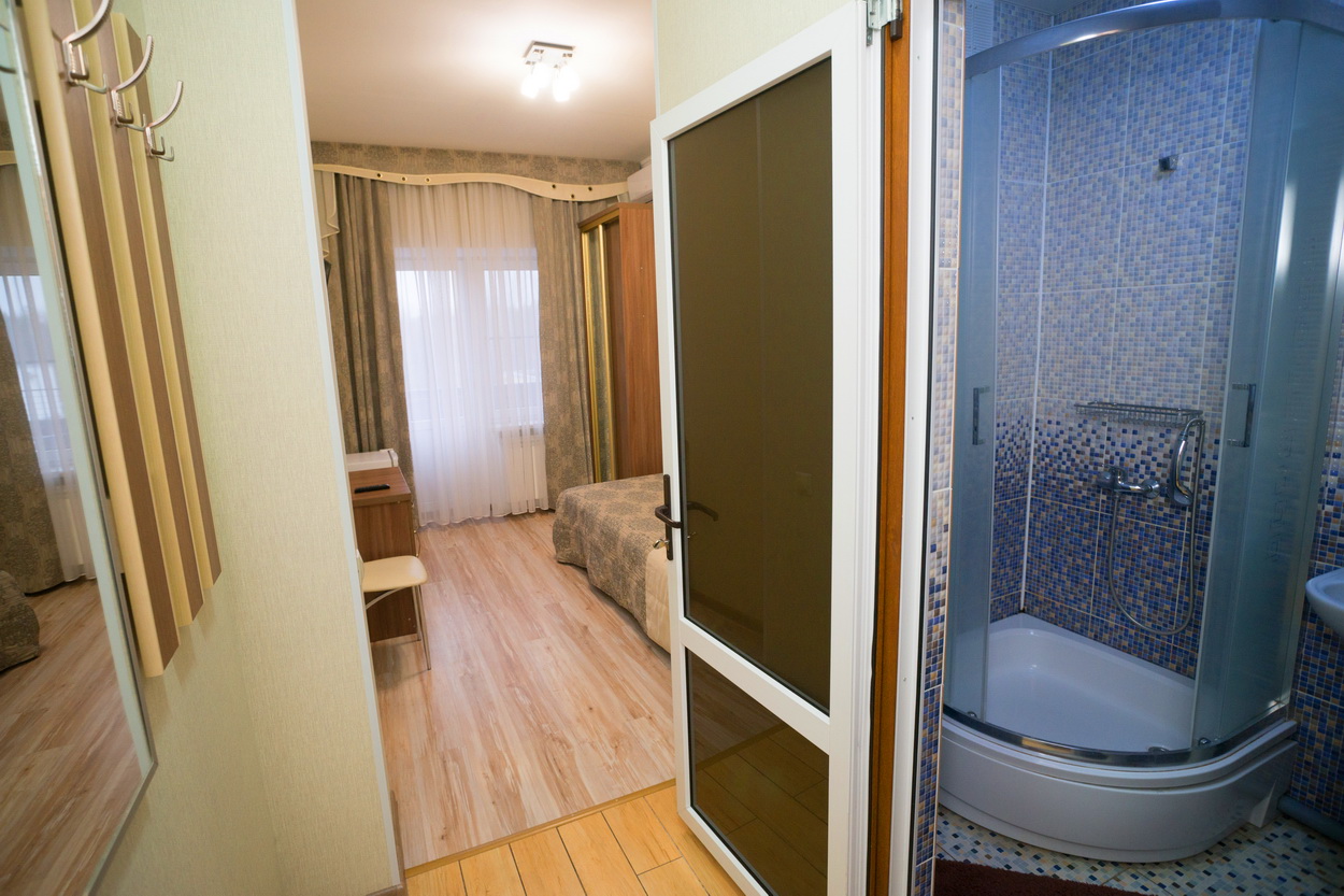 В номере: шкаф-купе, стол-тумба, 2 стула, кровать 1,20 м., ЖК телевизор, кондиционер, холодильник, зеркало, вешалка для верхней одежды.