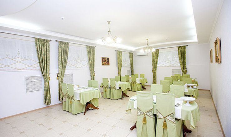 Приемы пищи проходят в банкетном зале. Здесь причудливым образом сочетаются оттенки шоколадного и розового цвета, и площадка выглядит торжественно. Шахматный пол придает пространству строгость, не нарушая ореола элегантности. Главное украшение зала – огромные панорамные окна, из которых открывается потрясающий вид на живописные окрестности.