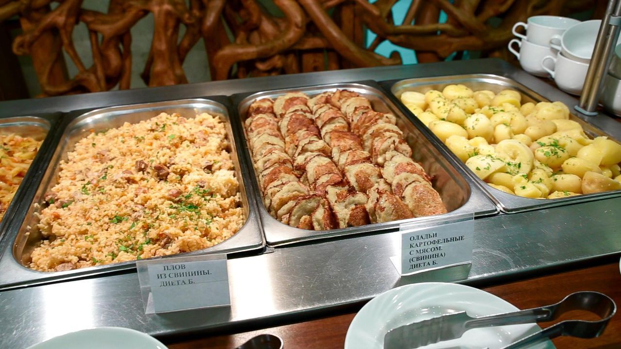 Гостям, проживающим и проходящим лечение по путевке в санатории «Солнечный берег», предоставляется сбалансированное 5-разовое питание по системе «меню-заказ». При составлении плана питания учитываются как медицинские назначения лечащего врача, так и индивидуальные вкусовые пристрастия гостей. Гости могут выбрать для себя питание в соответствии с разработанными разгрузочными диетами, а также постное меню на период религиозных праздников. Также ежедневно в вечернее время в санатории работает бар, где гости могут перекусить между основными приемами пищи, а также выпить прохладительные или горячие напитки.