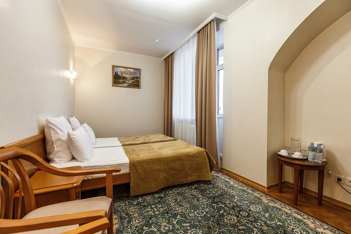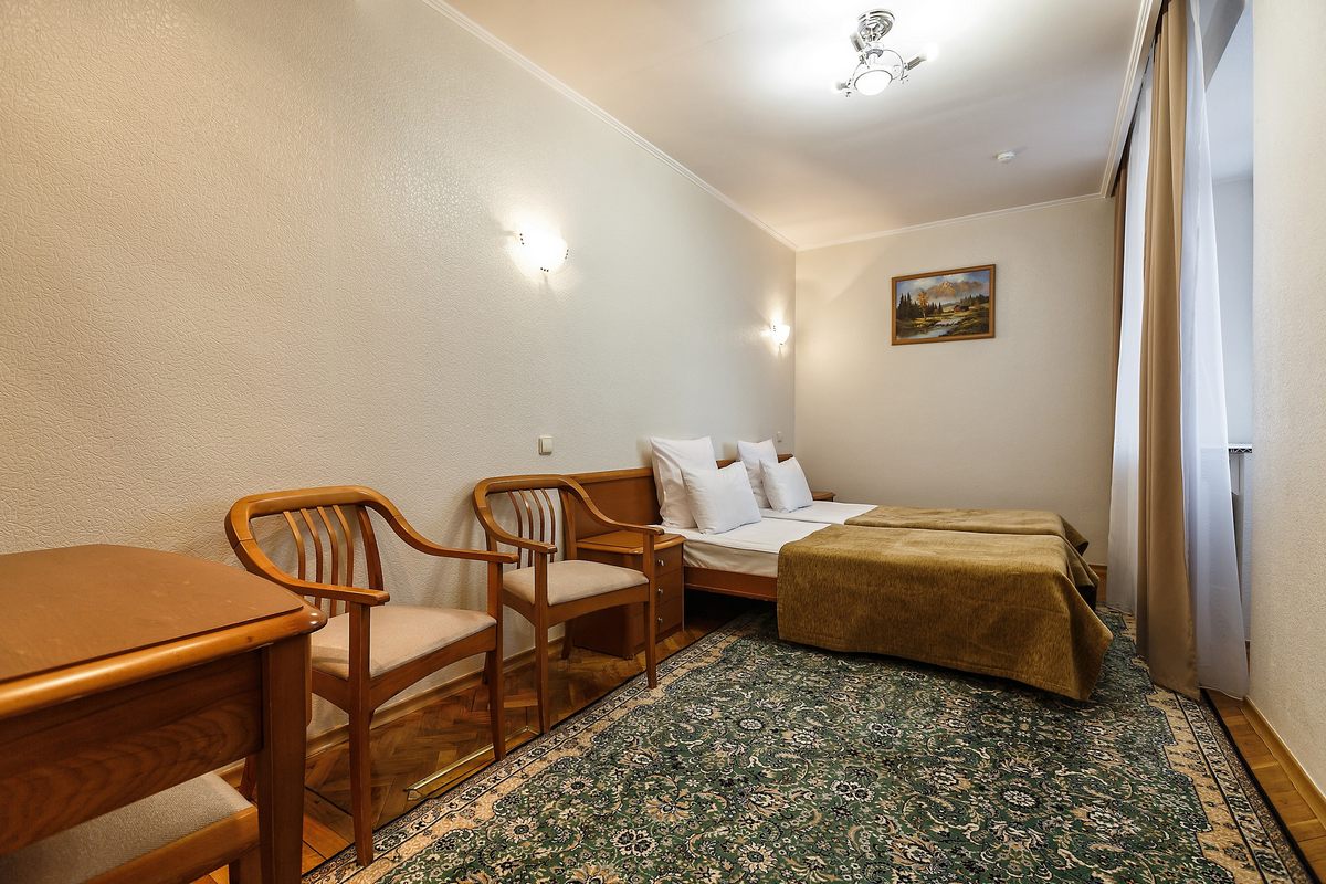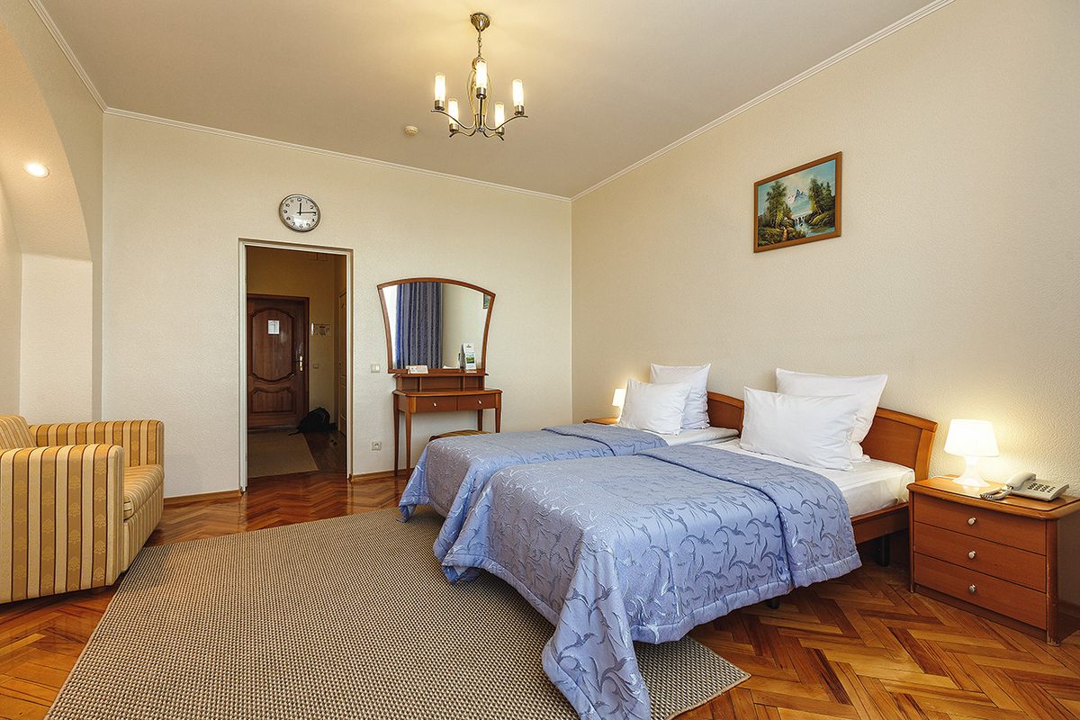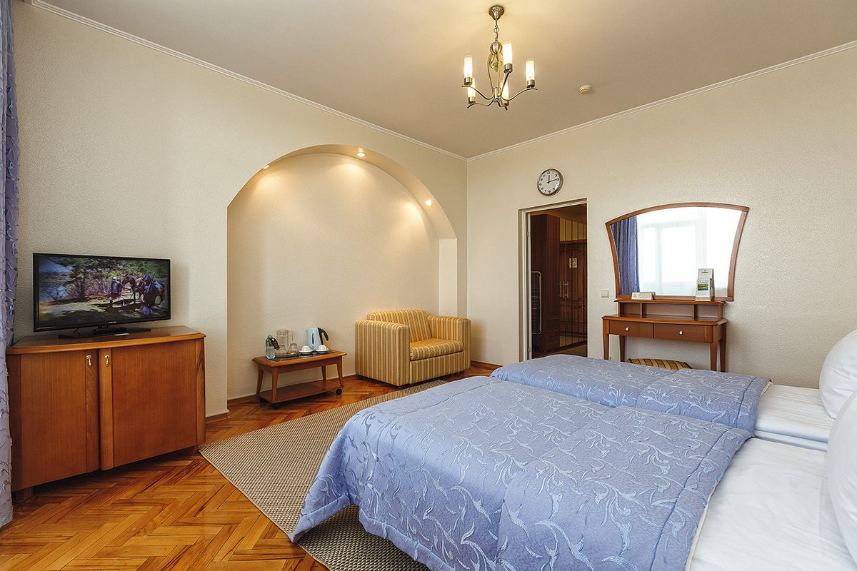 В номере: две кровати односпальные, прикроватные тумбочки, столы журнальный и туалетный, шкаф, кресло, телевизор, холодильник, чайник, телефон, сушилка для белья
