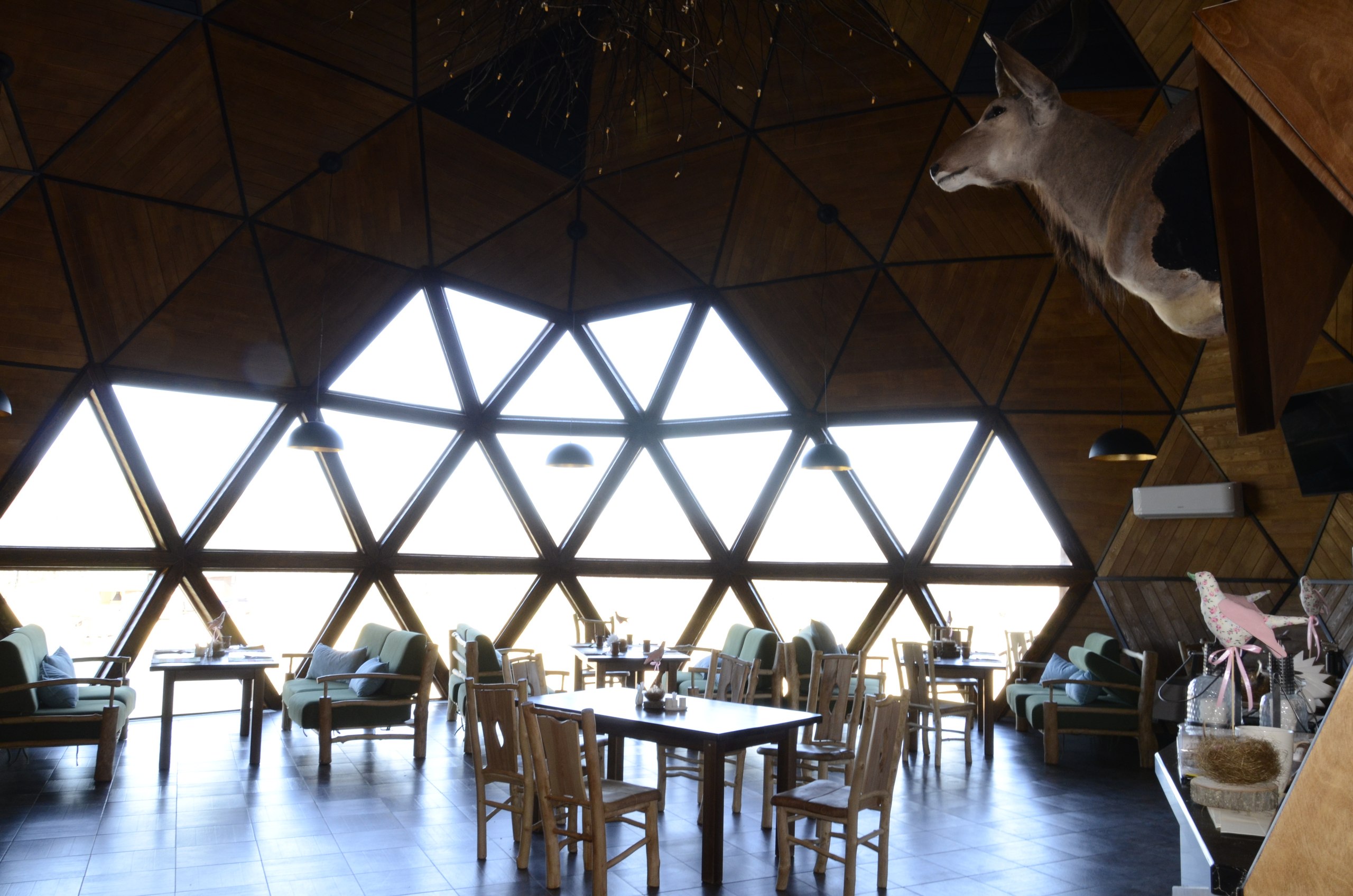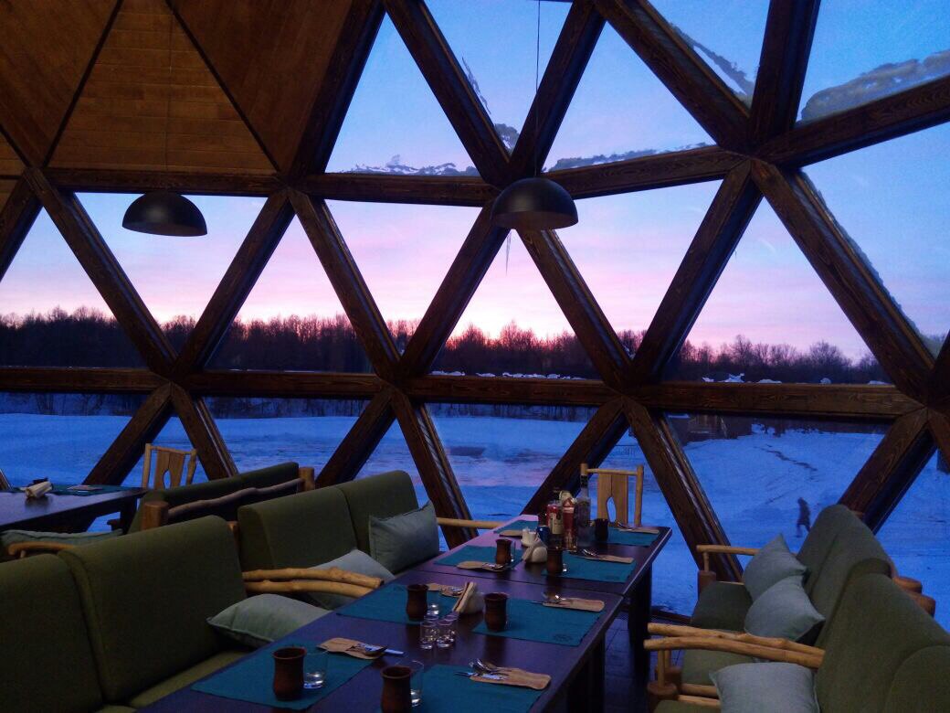 Интерьер ресторана сочетает в себе мебель из массива дерева, украшенные деревянные балками, глиняную посуду и текстиль, создавая благоприятное впечатление о месте. Каждая деталь помещения способствует общему уюту и выгодно смотрится в просторном зале под деревянным куполом.