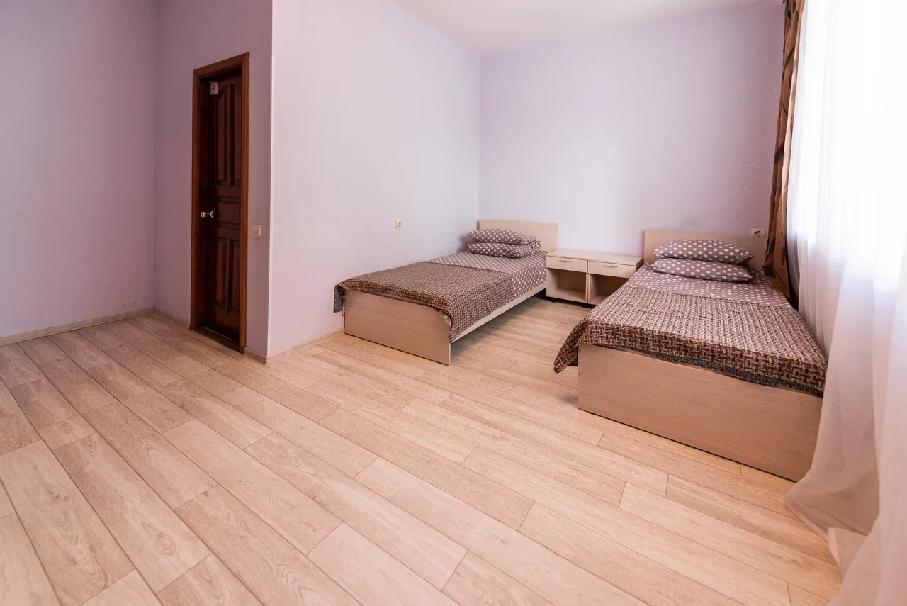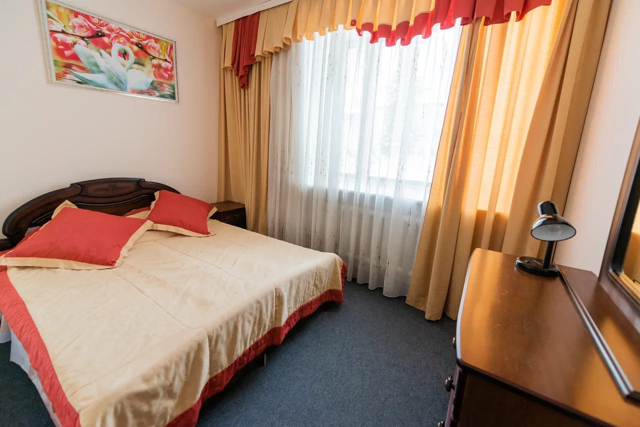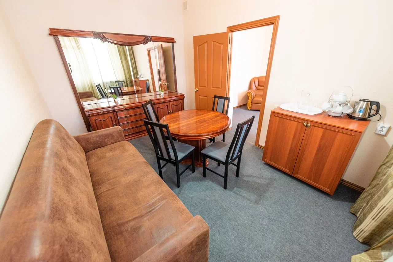 Оснащение номера: две односпальные кровати, прикроватная тумбочка, стол, стулья, шкаф, комод, диван, журнальный стол, телевизор, холодильник, чайный набор посуды, электрочайник