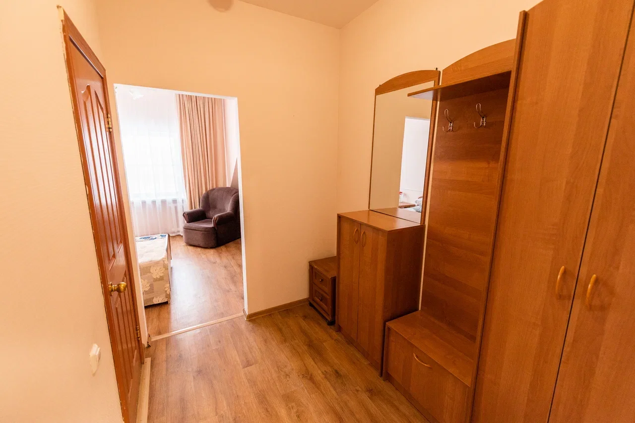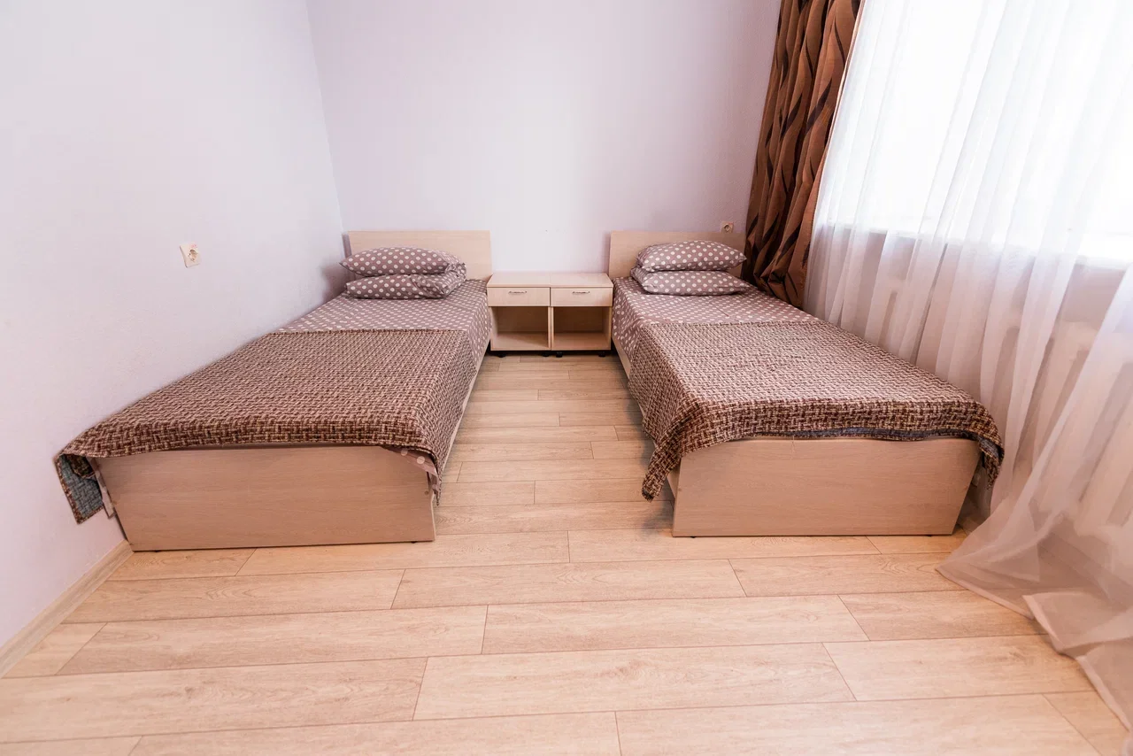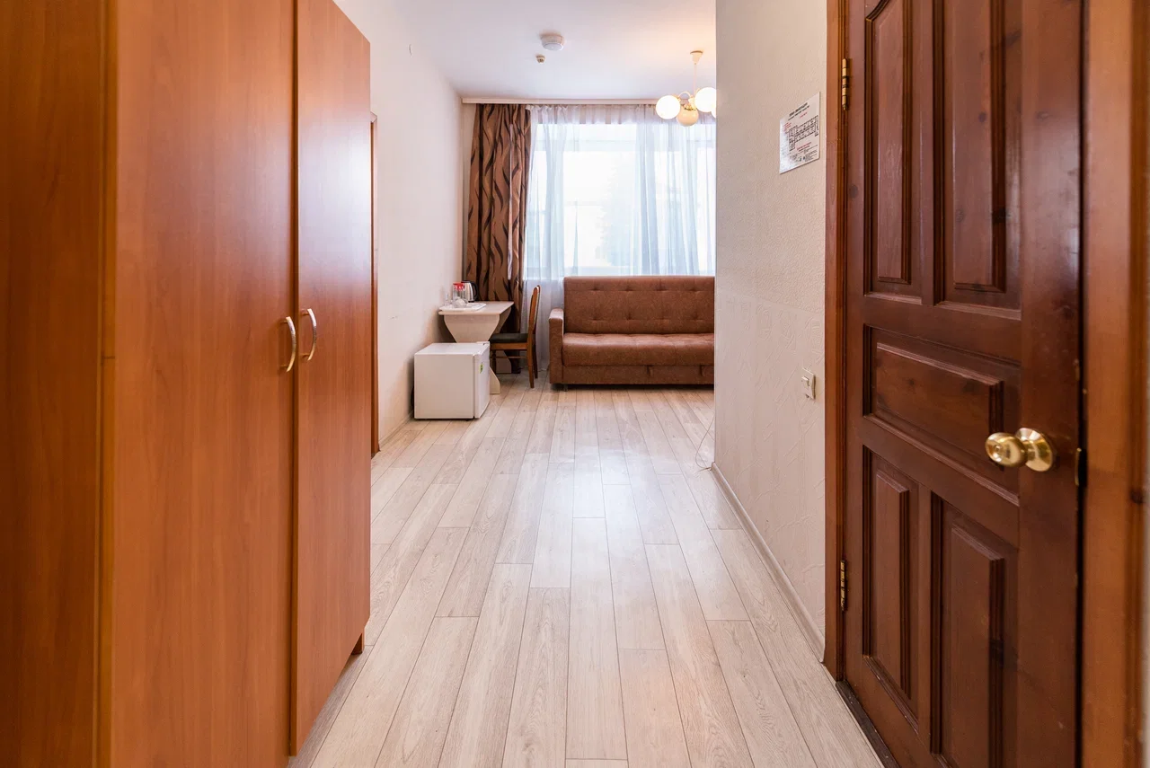 Оснащение номера: две односпальные кровати, прикроватная тумбочка, стол, стулья, шкаф, комод, диван, журнальный стол, телевизор, холодильник, чайный набор посуды, электрочайник