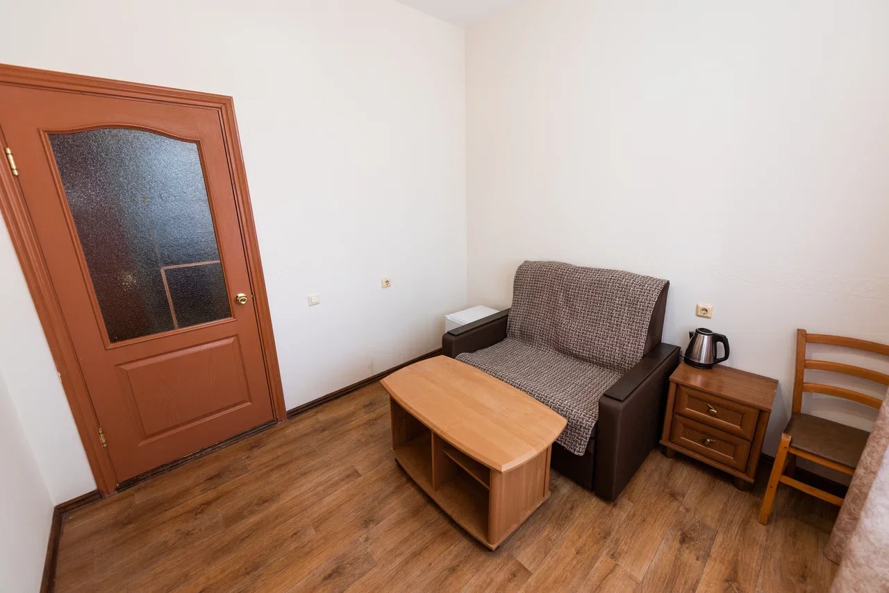 Оснащение номера: двуспальная кровать, прикроватная тумбочка, стол, стулья, шкаф, кресло, телевизор, холодильник, чайный набор посуды, электрочайник