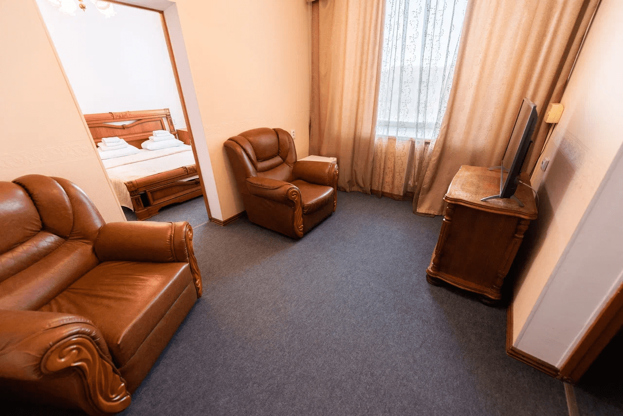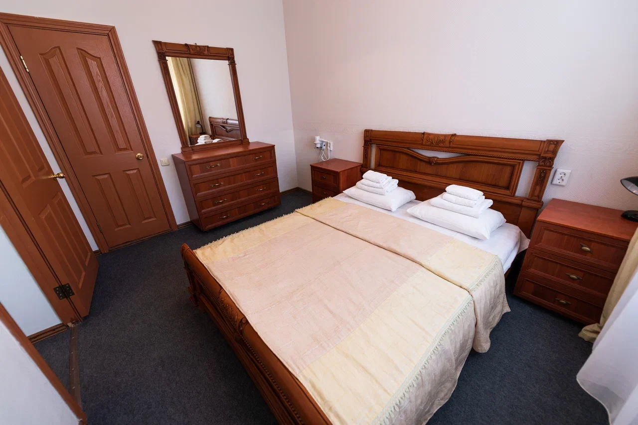 Оснащение номера: кровать двуспальная, прикроватная тумбочка, стол, стулья, шкаф, комод, диван, журнальный стол, телевизор, холодильник, чайный набор посуды, электрочайник